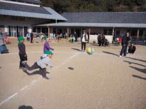 その後は、かるた遊びやこま回しに、ドッチボール、一本下駄、鉄棒など